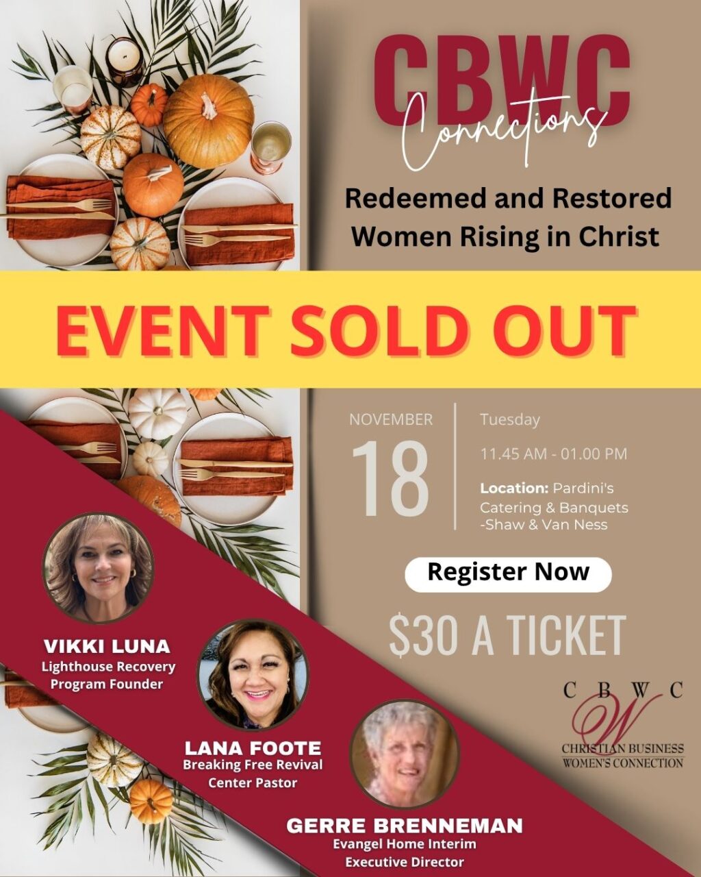Title: CBWC Connections Redeemed and Restored – Women Rising in Christ Speaker: Three Person Panel Vikki Luna, Lighthouse Recovery Program Founder Lana Foote, Breaking Free Revival Center Pastor Gerry Brenneman,…