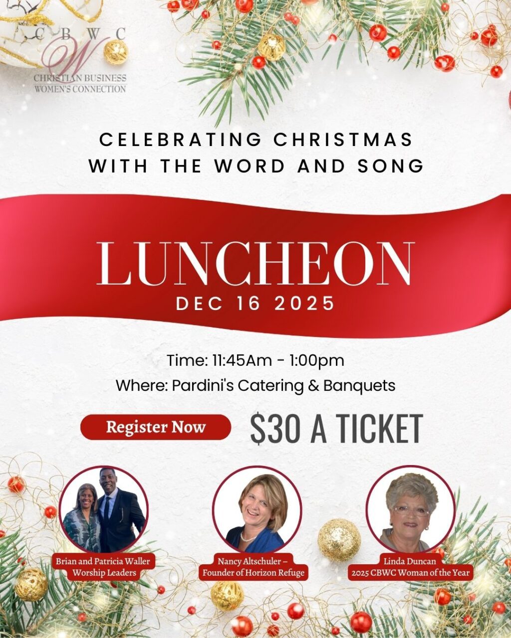 Celebrating Christmas with The Word and Song Who can attend: Women and Men Date: Tuesday, December 16, 2025 Doors Open: 11:30am Program: 11:45am – 1:00pm Location: Pardini’s Catering & Banquets…