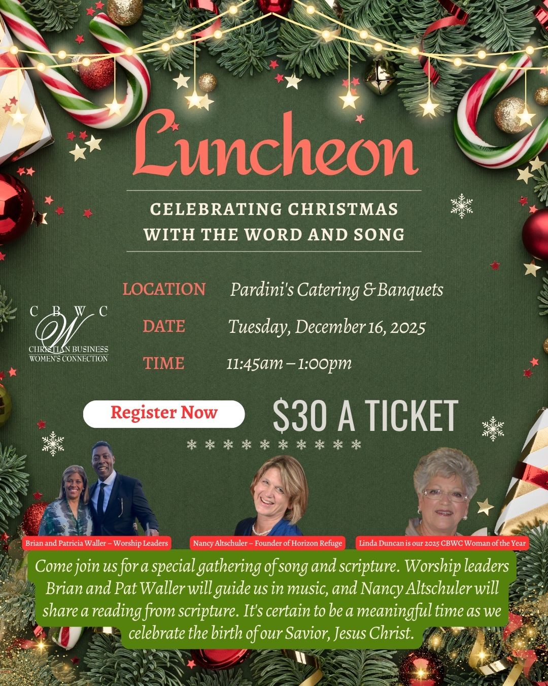 Celebrating Christmas with The Word and Song Who can attend: Women and Men Date: Tuesday, December 16, 2025 Doors Open: 11:30am Program: 11:45am – 1:00pm Location: Pardini's Catering & Banquets…